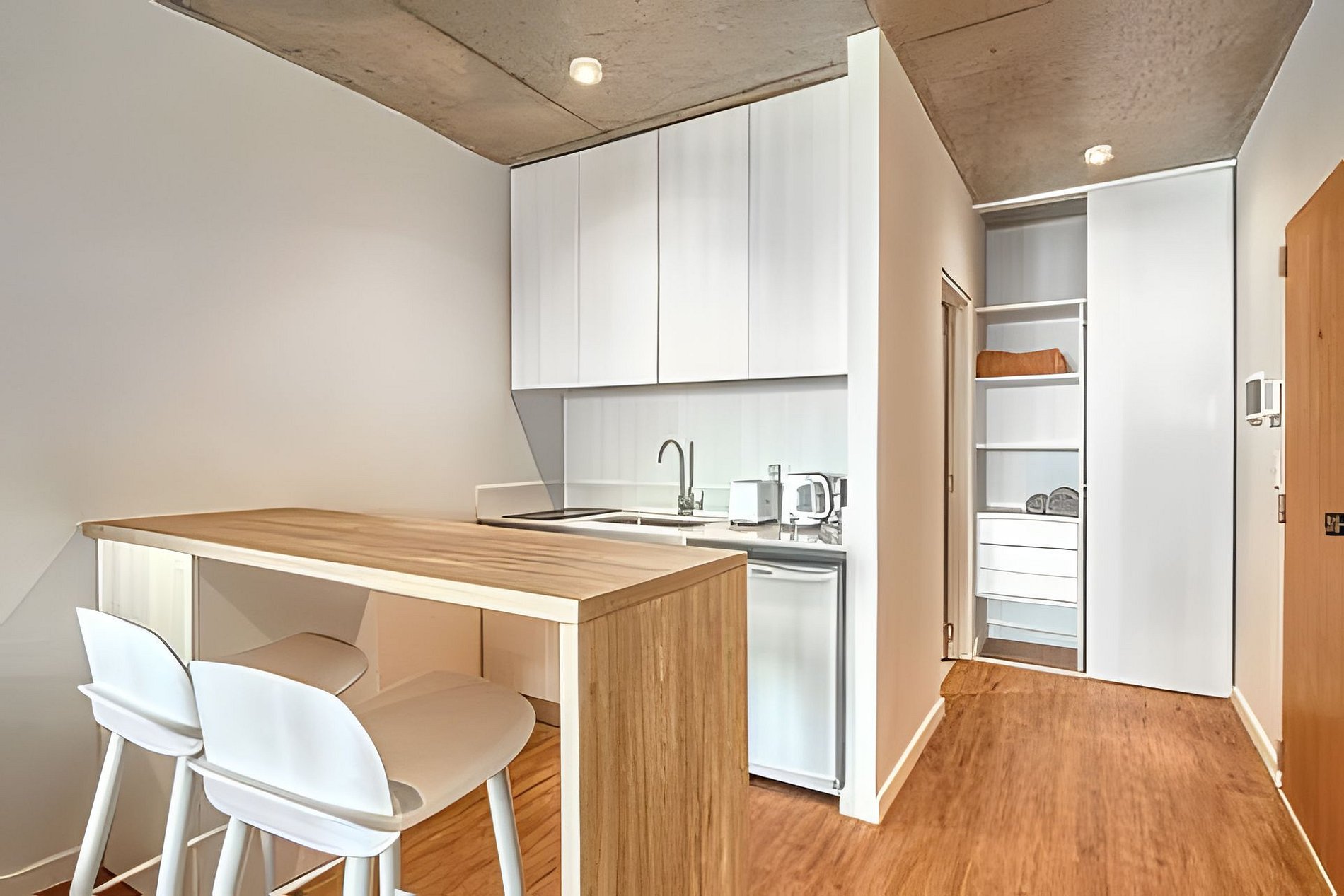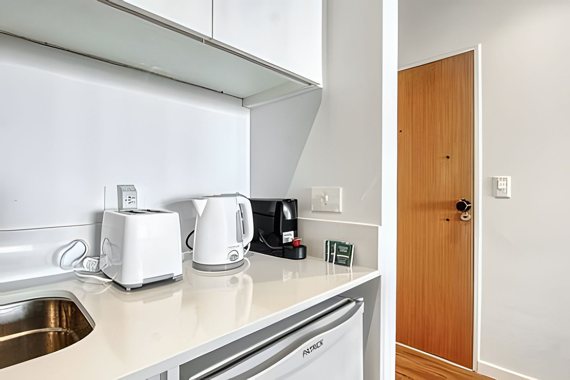 Monoambiente con kitchenette, microondas, cafetera Nespresso, tostadora, set de cacerolas para cocinar, vajilla para 4 personas. 1 cama matrimonial y un sillón cama que se hace matrimonial con una medida de 1,90x 1,40. Departamento cómodo para 3 personas aunque si hay niños, pueden acomodarse 4 personas. Tiene tambien secador de Pelo, que se encuentra amurado en la pared del baño.
