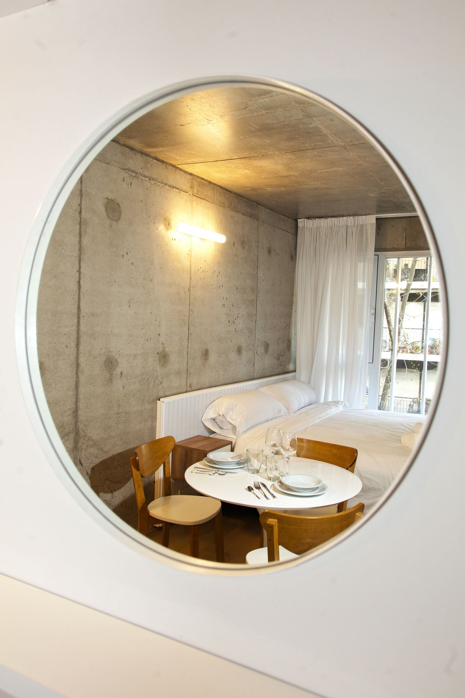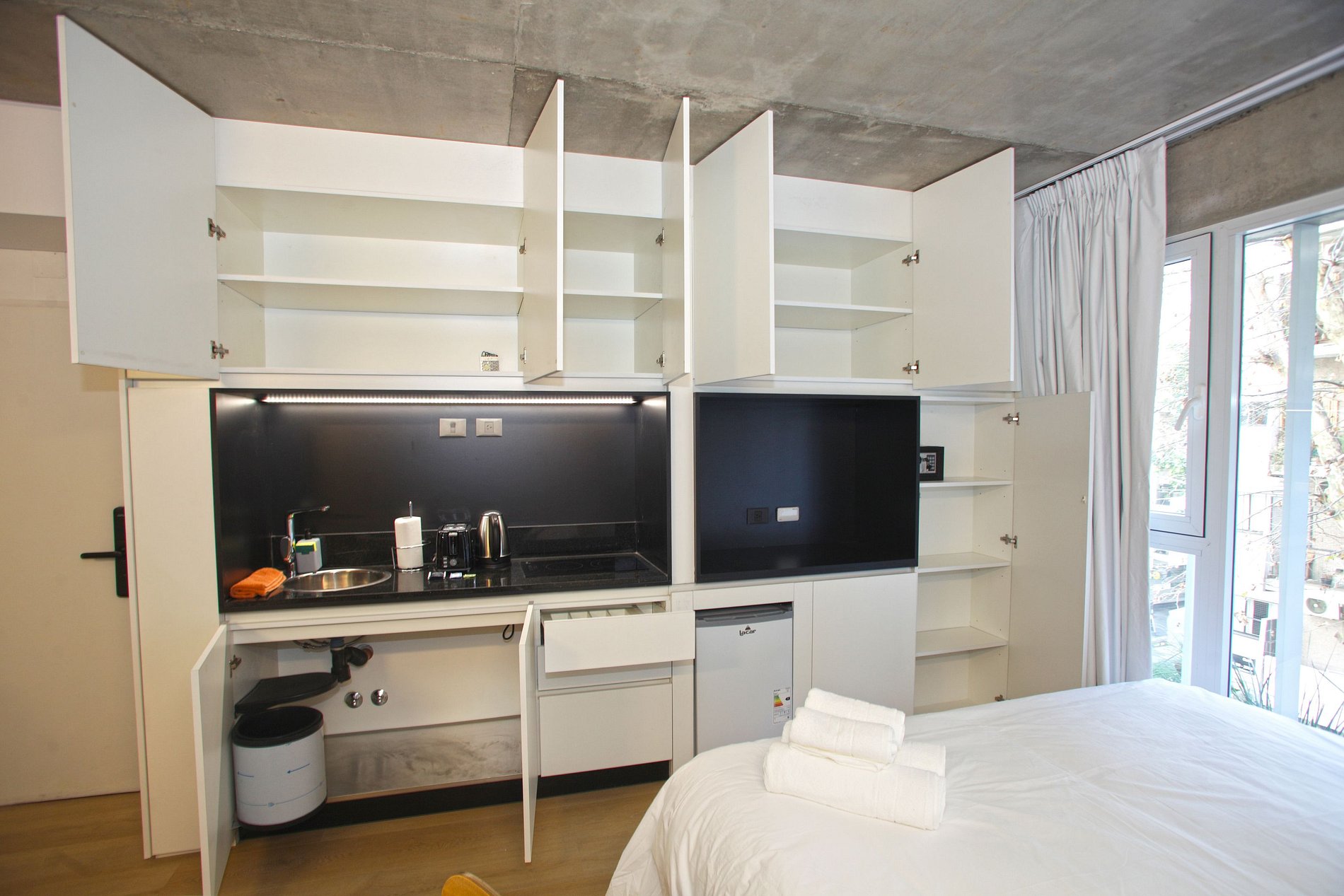 Similar a una habitación de hotel, pero con la opción de poder cocinar.