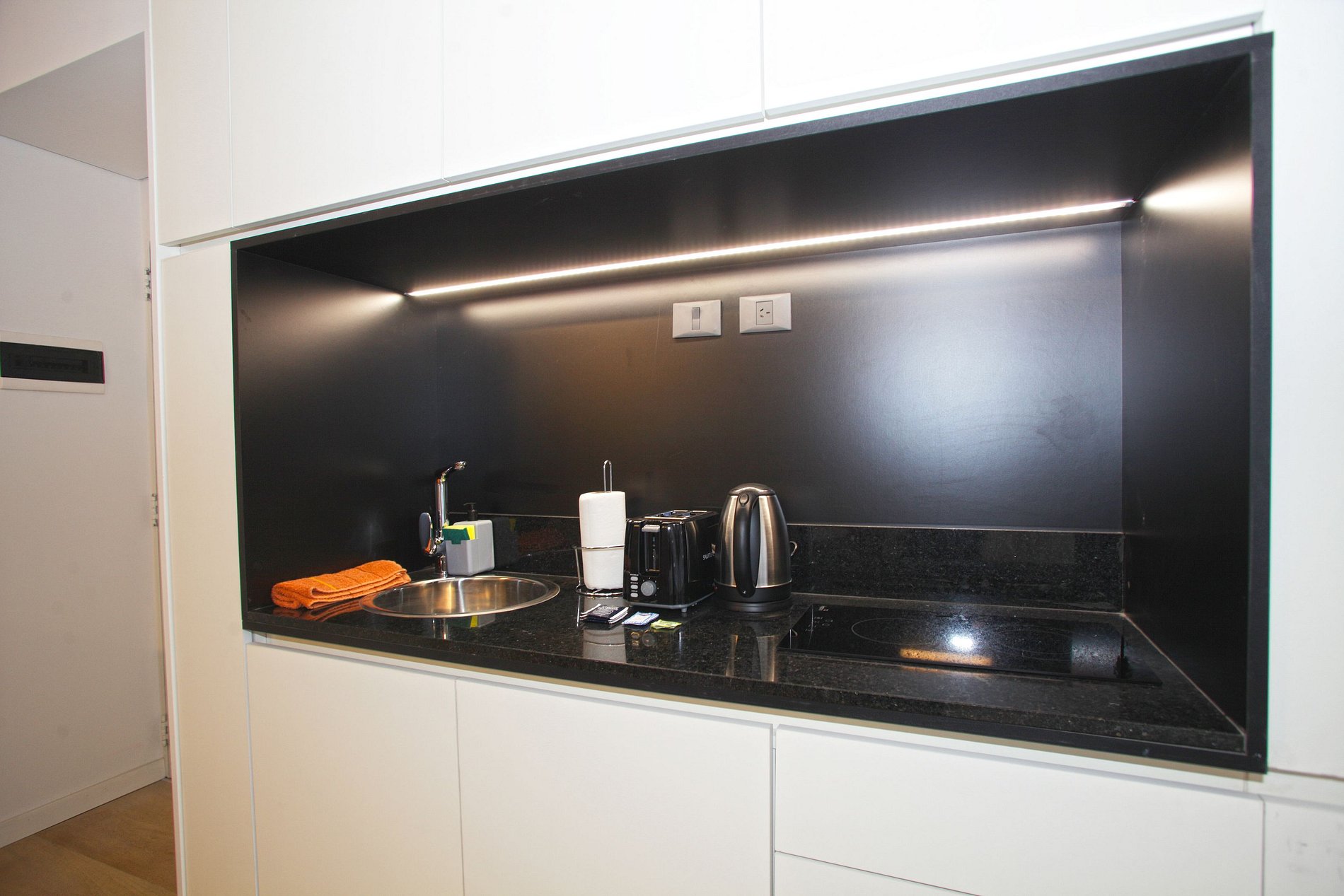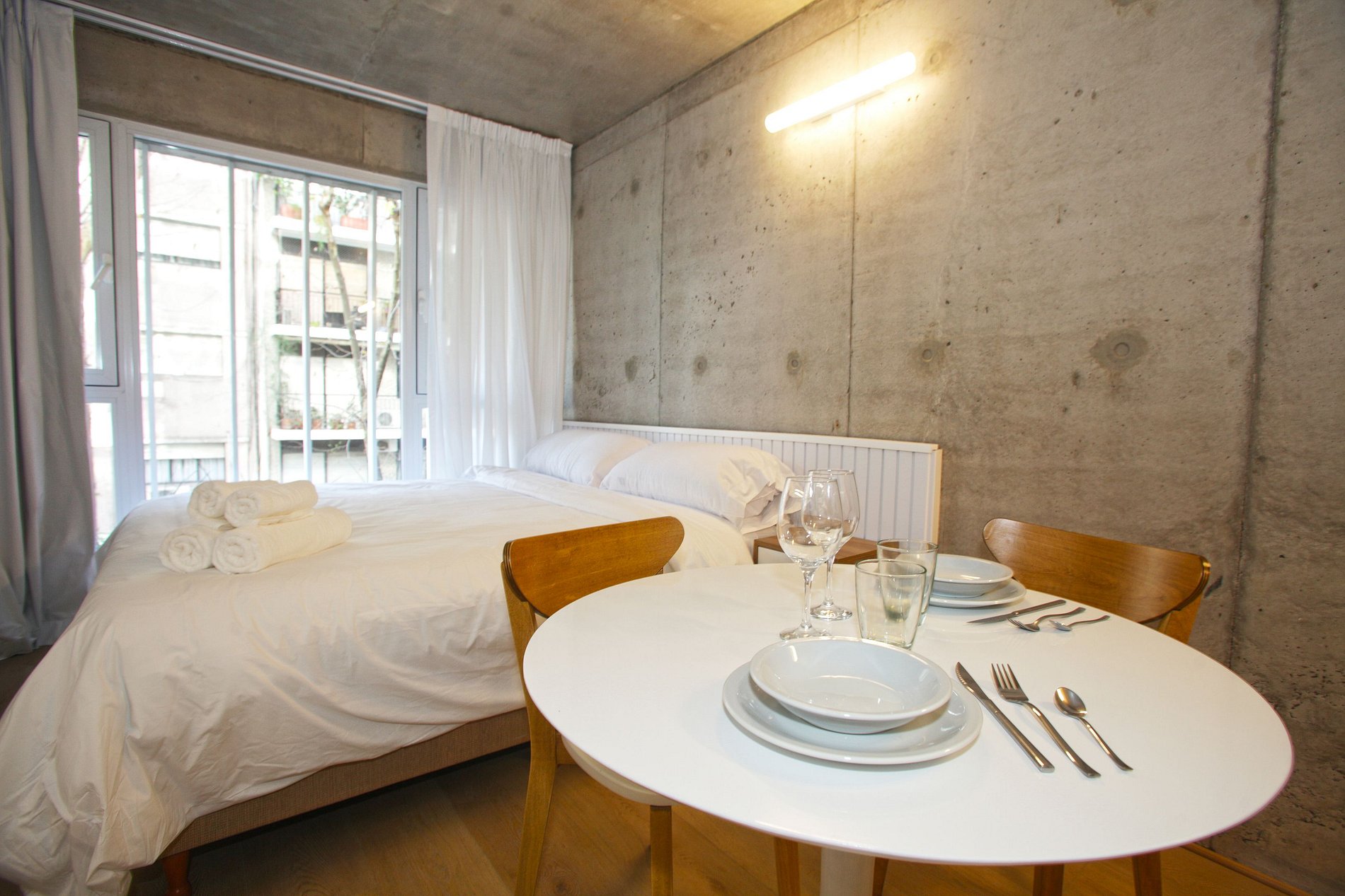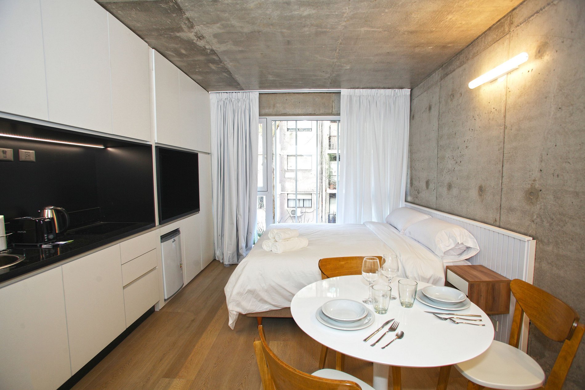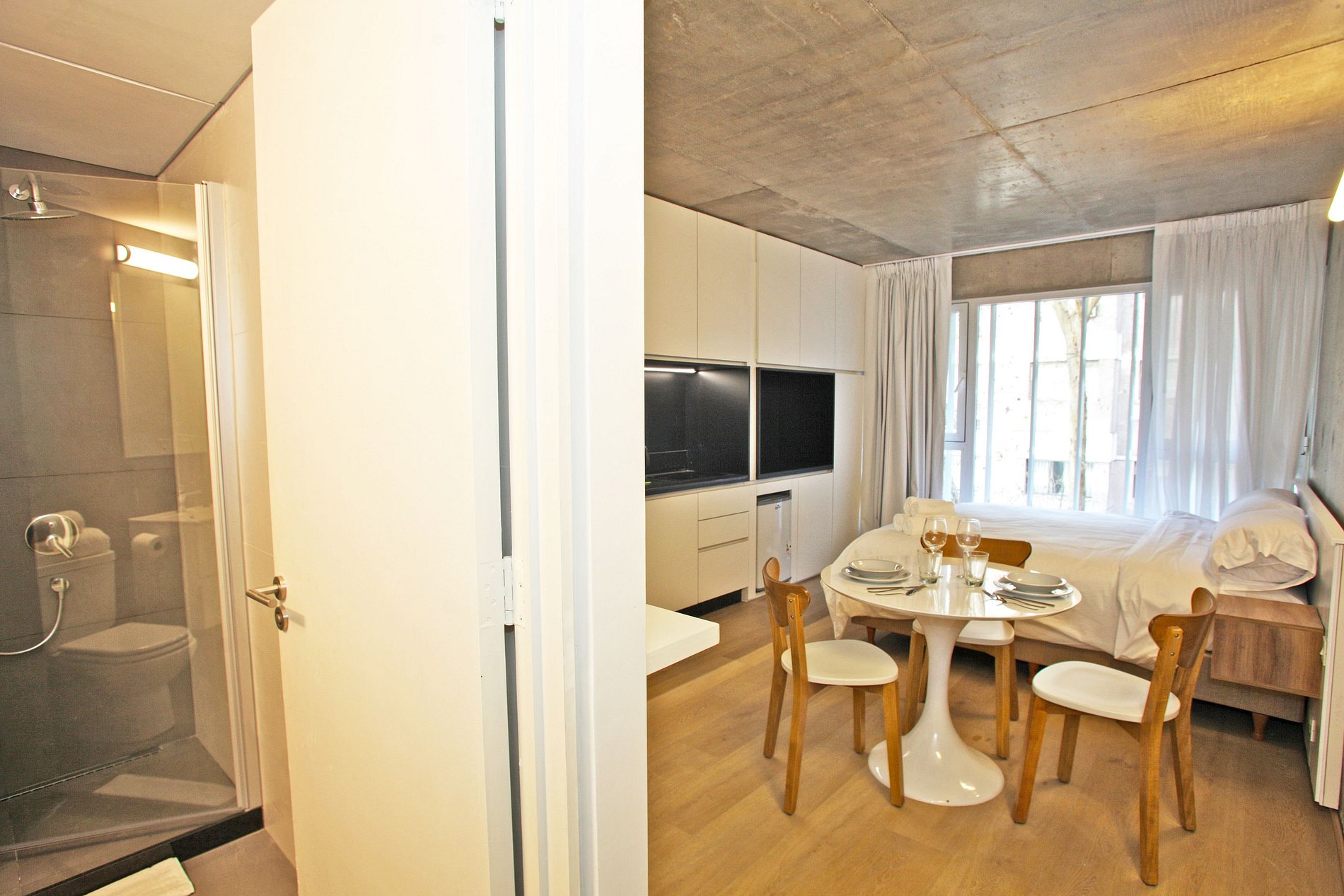 Similar a una habitación de hotel, pero con la opción de poder cocinar.