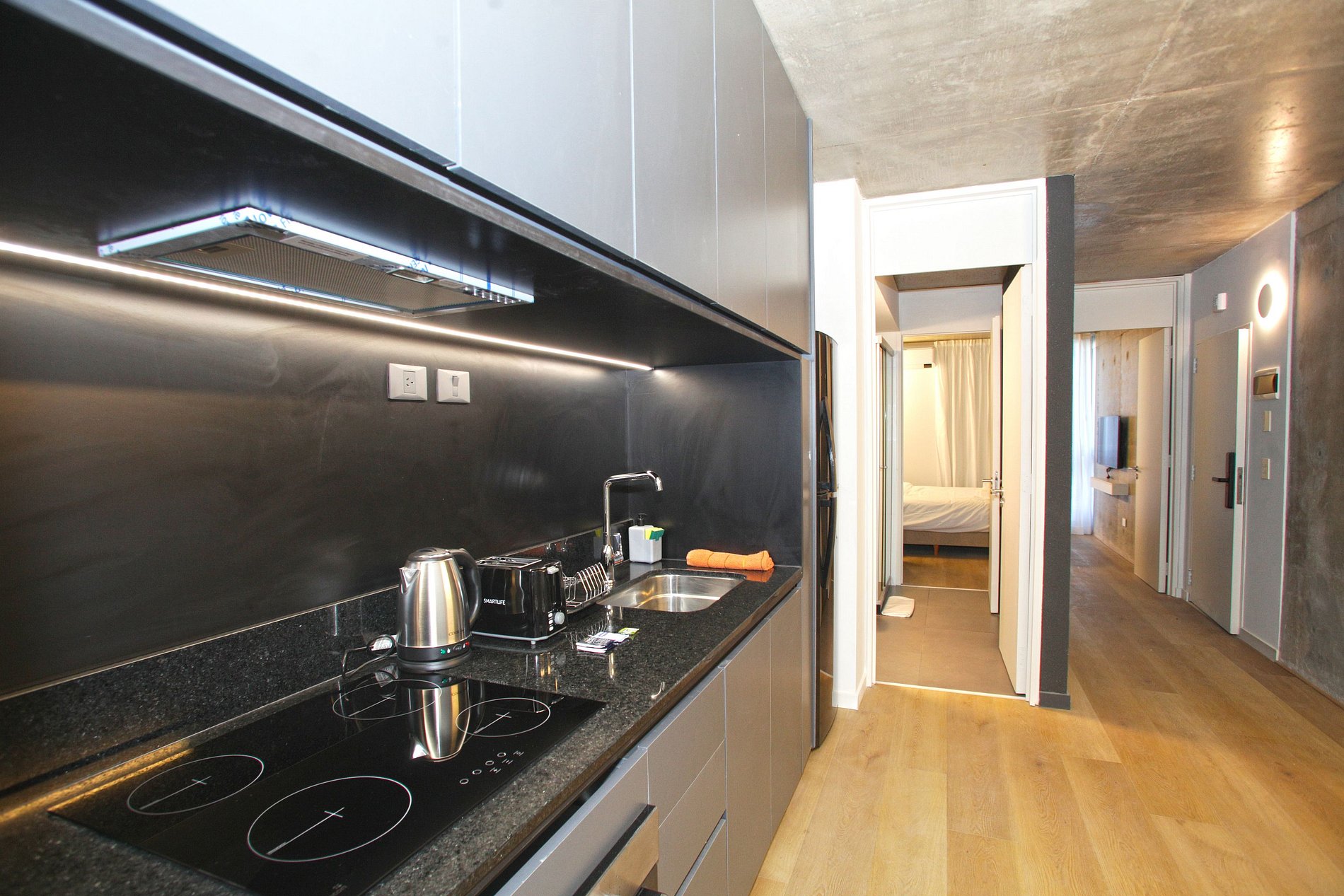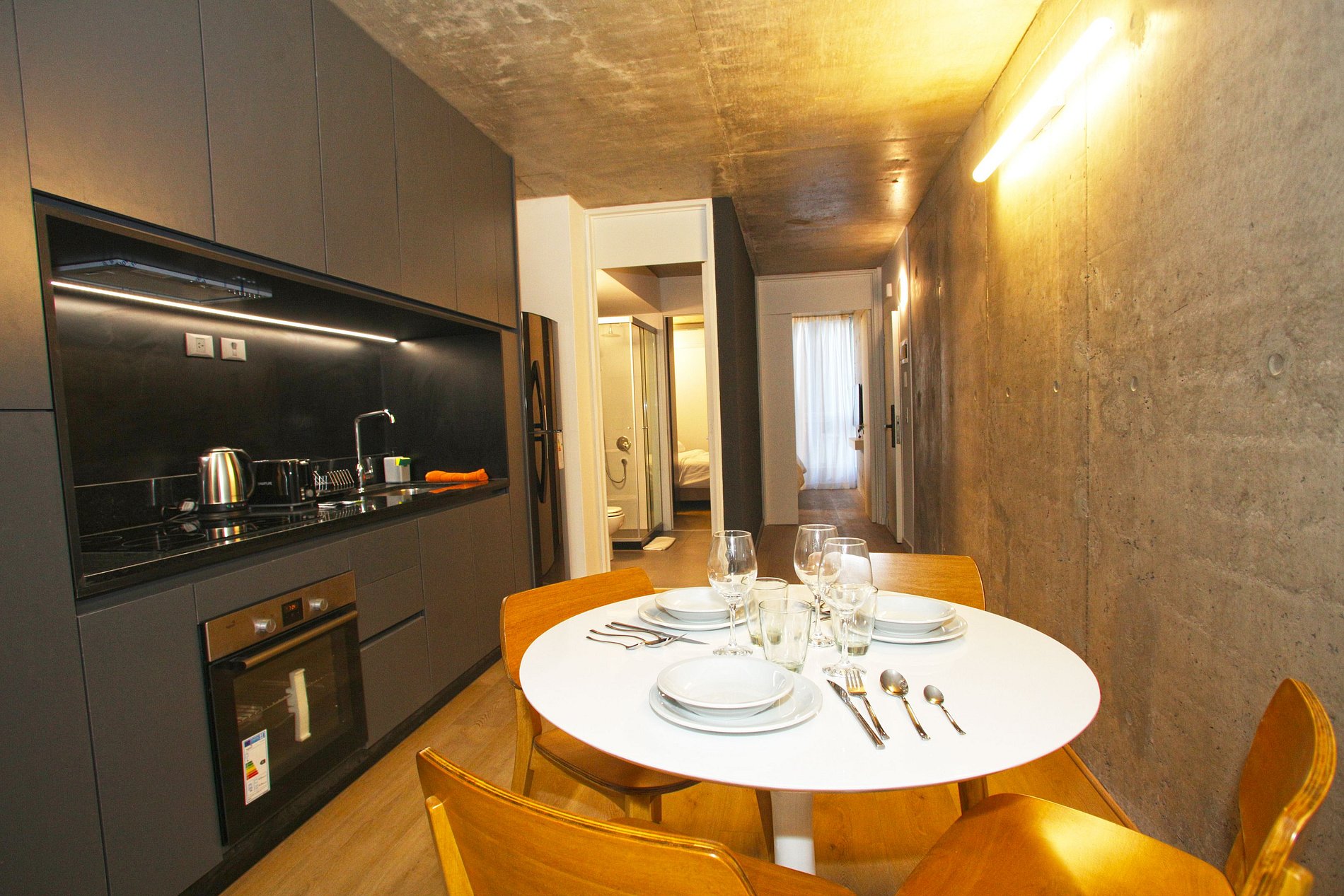 Cuenta con cocina completa, microondas, tostadora, set de cacerolas para cocinar, vajilla para 4 personas.