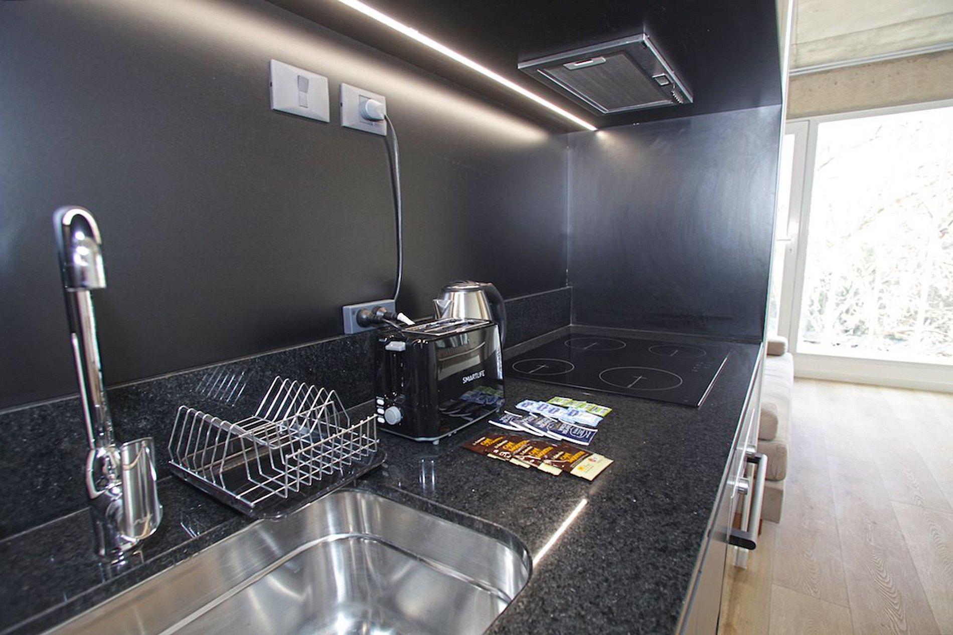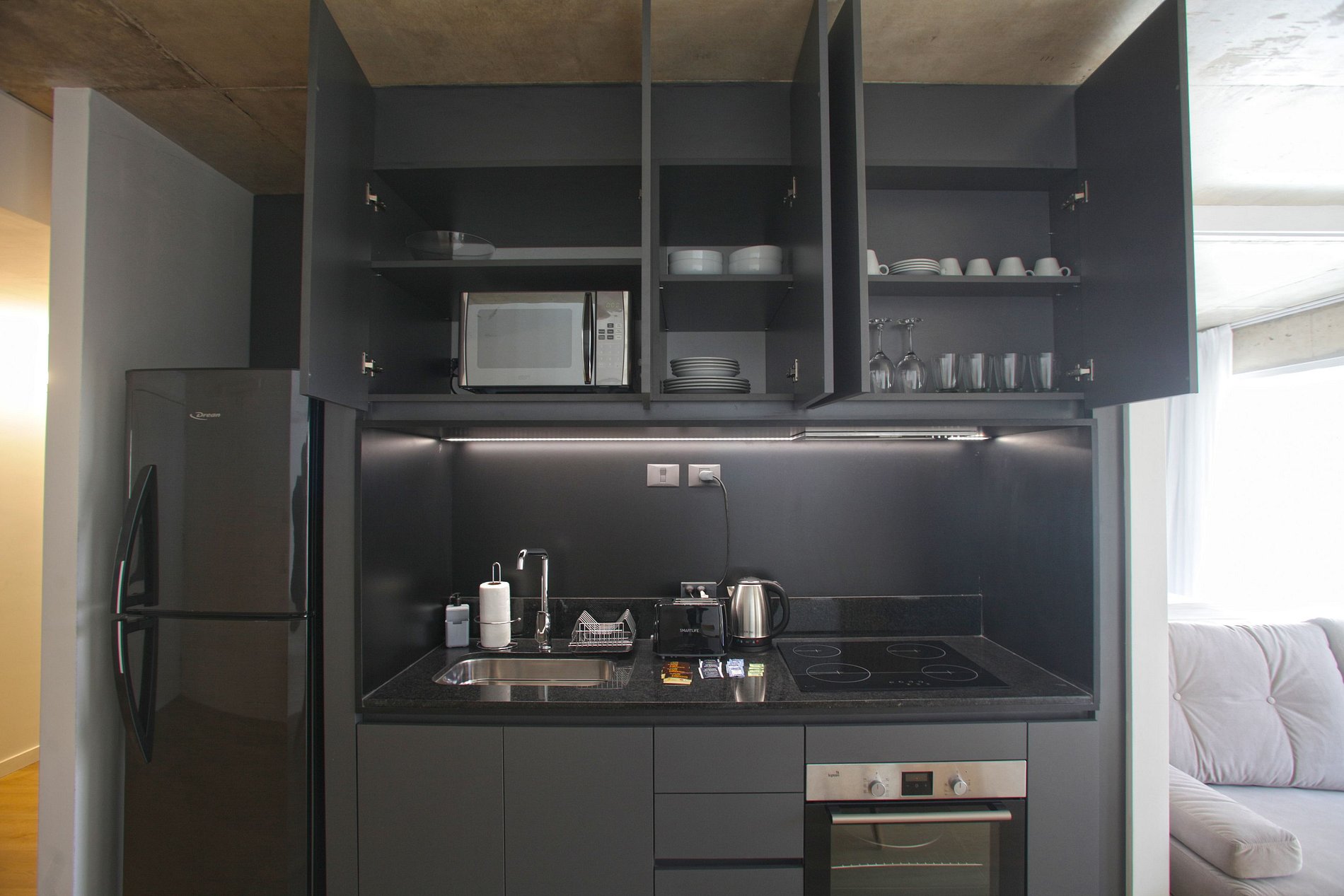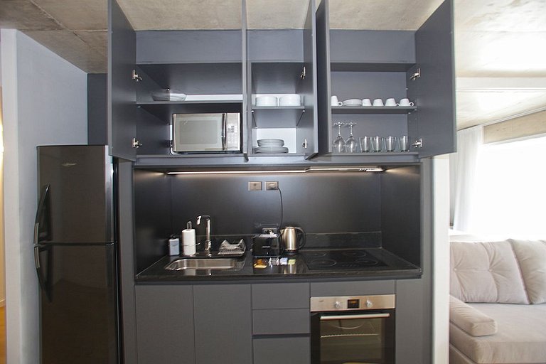 Cocina completa, microondas, tostadora, cacerolas, vajilla.
