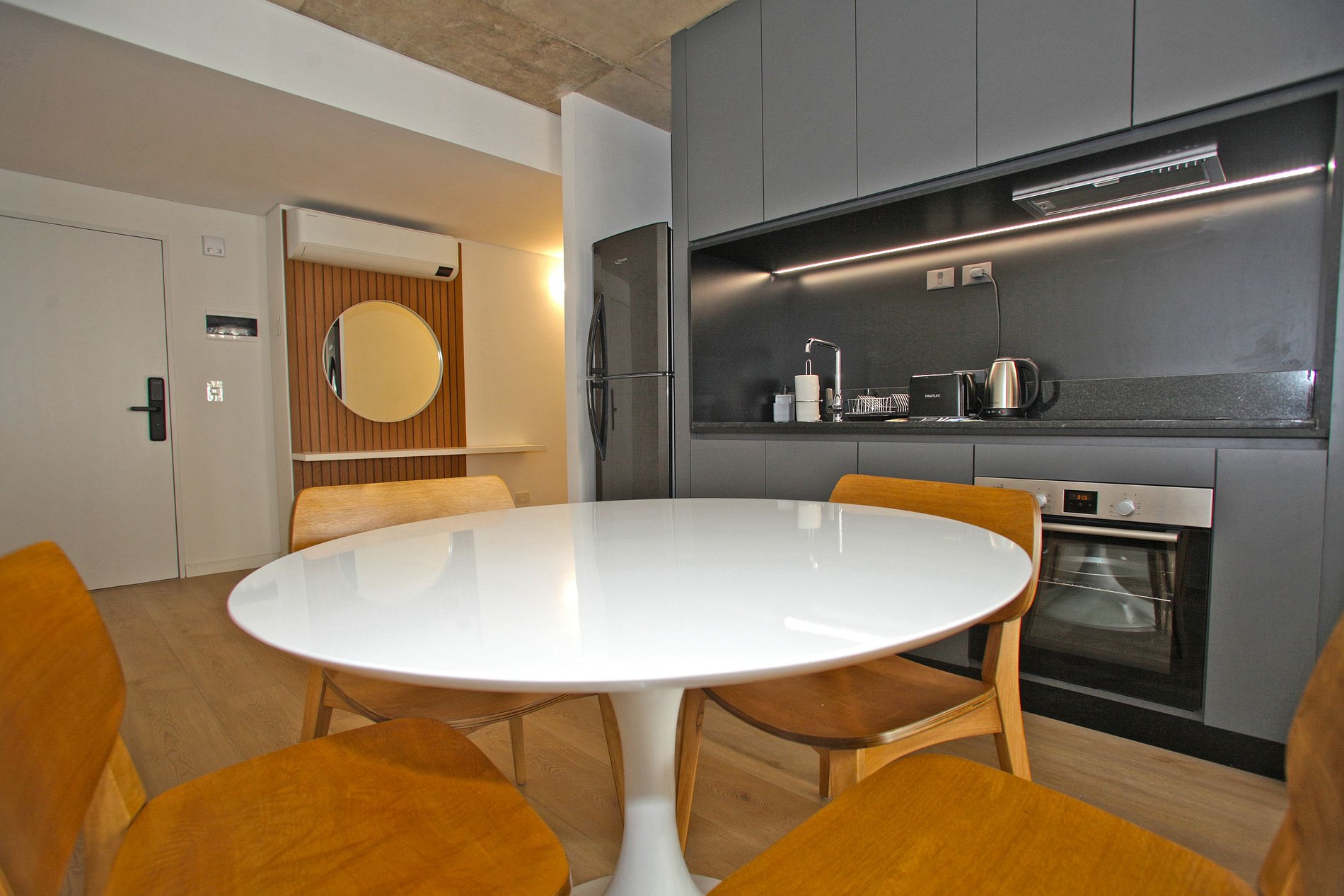 El edificio posee un restaurant en la planta baja con un horario de 8:00 AM A 20 PM. para disfrutar de todas tus comidas.