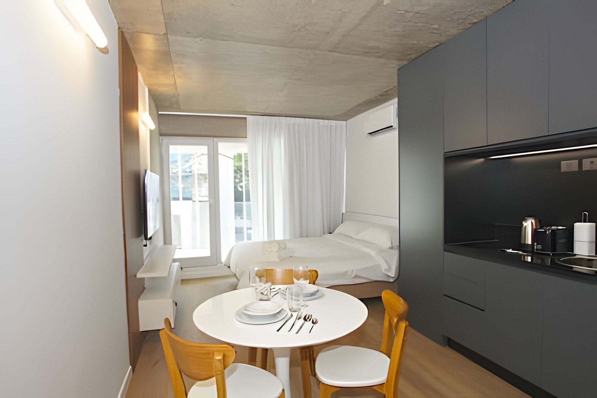 Monoambiente con capacidad para 2 personas. Cocina kitchenette. Equipada con microondas, tostadora, set de cacerolas, vajilla, pava eléctrica. 1 cama matrimonial de 1,90x1,80. Juego de Sillas y mesa. Baño Completo. Armario. SMART TV WIFI de 300 megas.