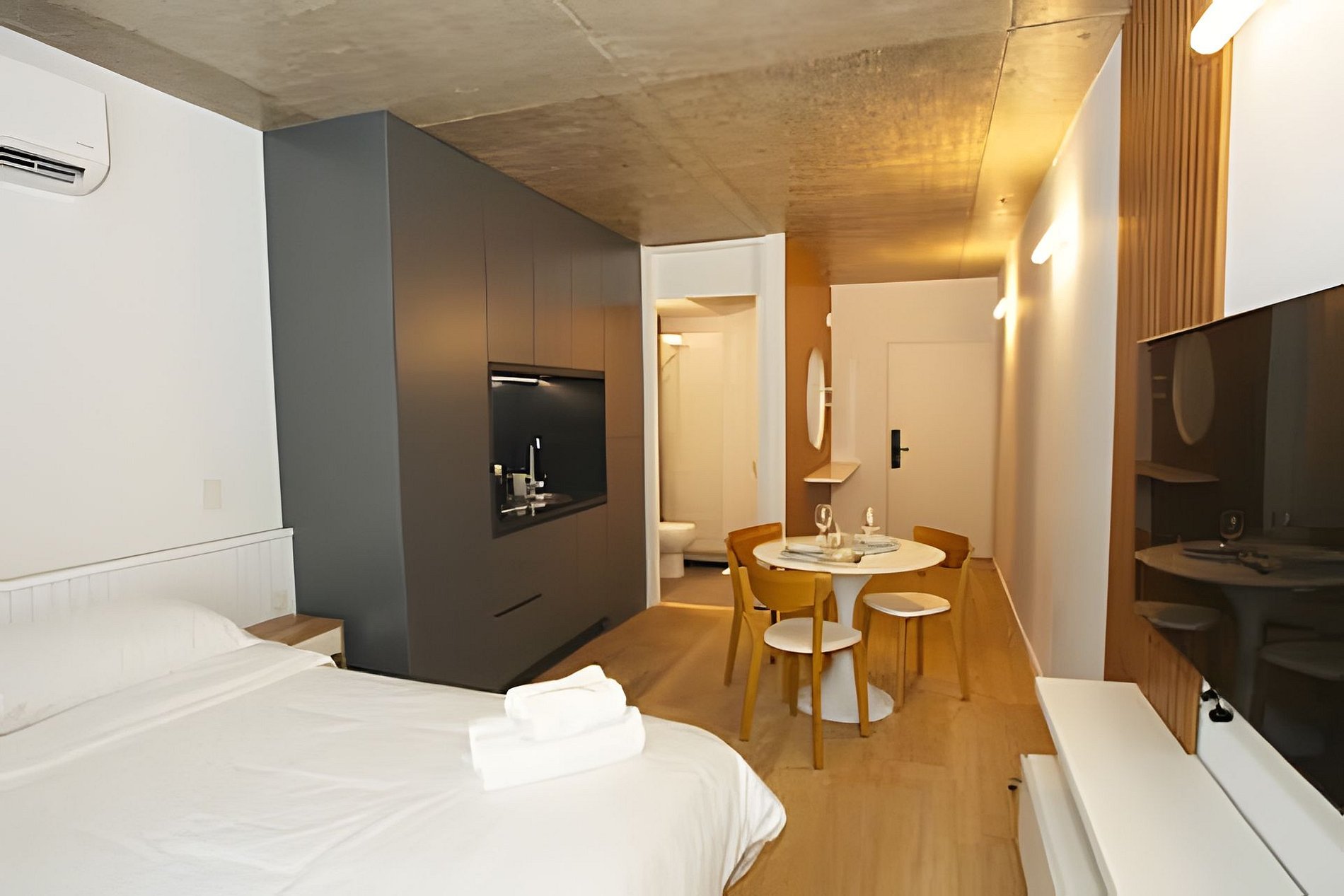 Monoambiente con capacidad para 2 personas. Cocina kitchenette. Equipada con microondas, tostadora, set de cacerolas, vajilla, pava eléctrica. 1 cama matrimonial de 1,90x1,80. Juego de Sillas y mesa. Baño Completo. Armario. SMART TV WIFI de 300 megas.